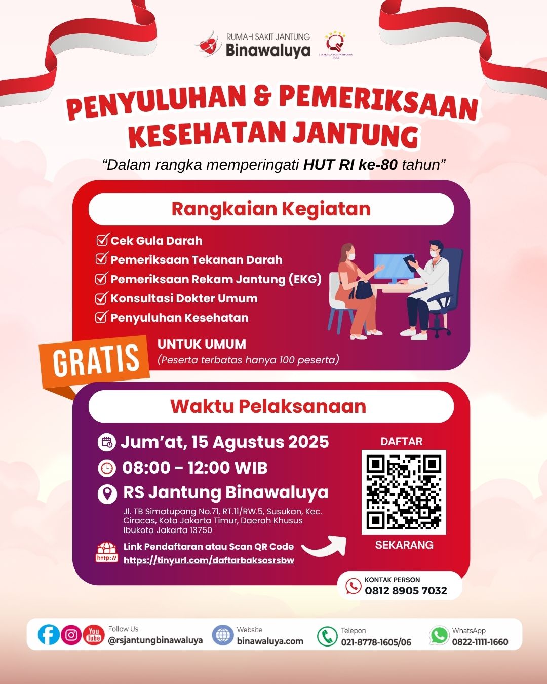 RS Jantung Binawaluya mengundang Bapak/Ibu untuk mengikuti penyuluhan dan pemeriksaan jantung pada :