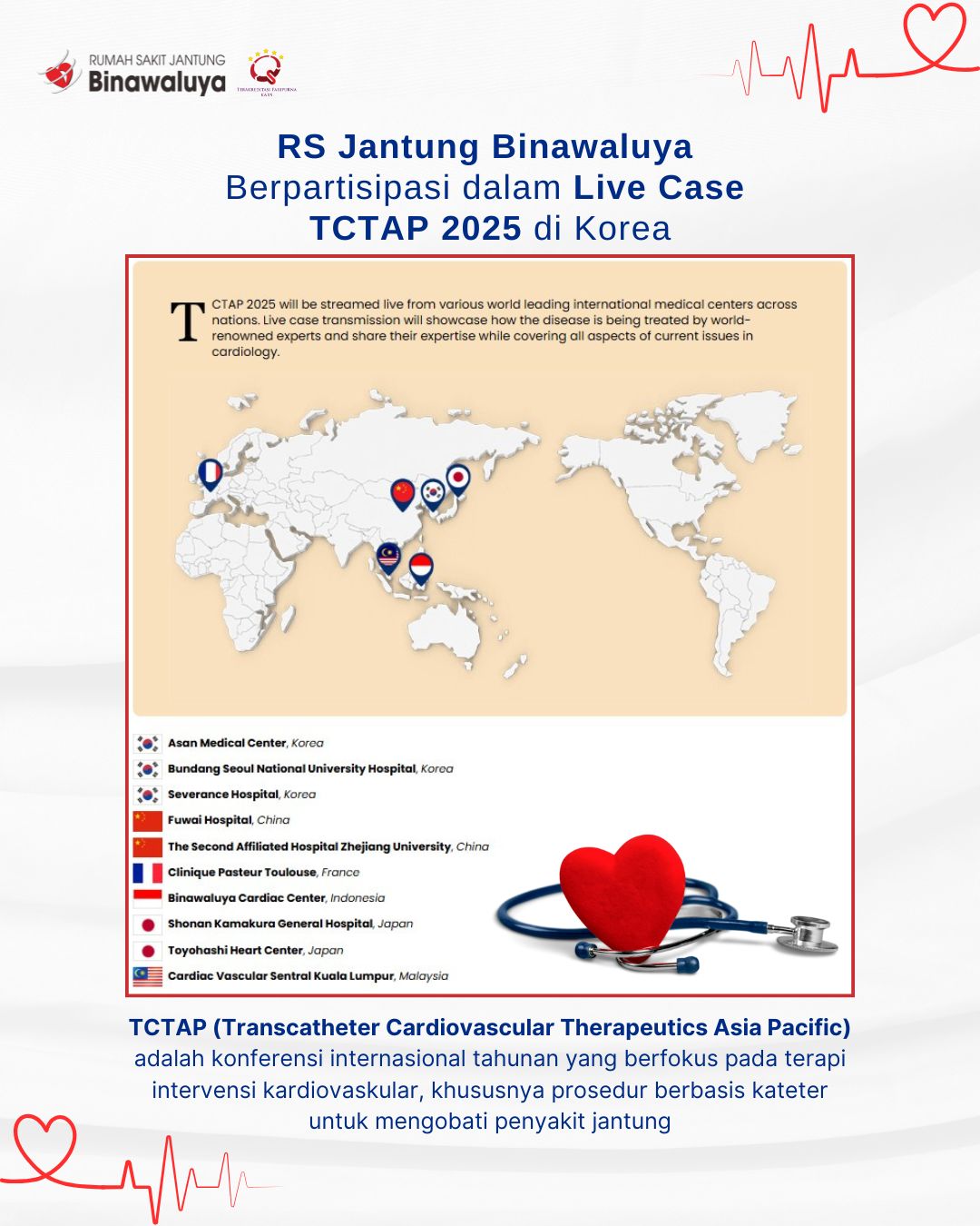 RS Jantung Binawaluya berpartisipasi di ajang bergengsi Kardiovaskuler Asia Pasifik yaitu acara TCTAP (Transcatheter Cardiovascular Therapeutics Asia Pacific) yang akan diselenggarakan pada tanggal 23-26 April 2025 di Korea.