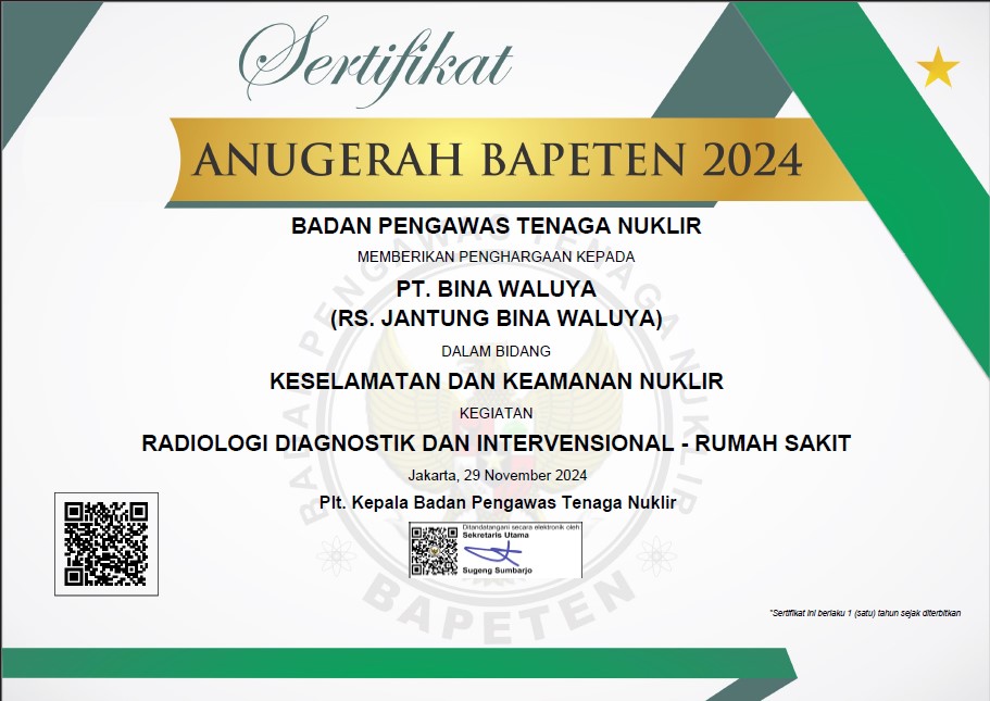 Rumah Sakit Jantung Binawaluya menerima penghargaan Anugerah BAPETEN (Badan Pengawas Tenaga Nuklir) dalam kategori Keselamatan dan Keamanan Nuklir. Penghargaan ini diberikan sebagai bentuk apresiasi atas komitmen RS Jantung Binawaluya dalam menerapkan standar keselamatan tinggi dan pengelolaan keamanan radiasi yang sesuai dengan regulasi nasional maupun internasional.