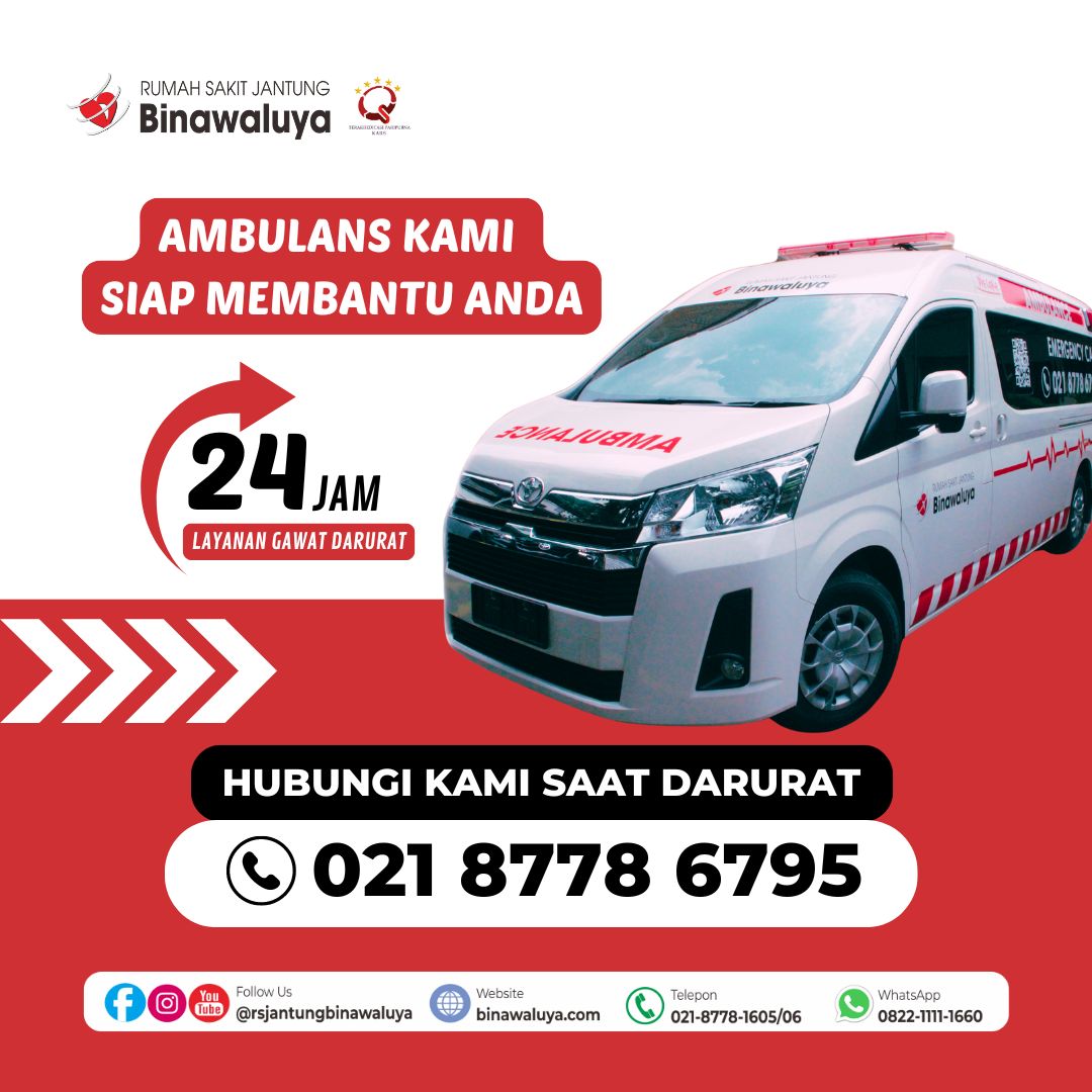 RS Jantung Binawaluya memiliki Ambulans Advance dengan tenaga medis yang kompeten. Ambulans advance merupakan ambulans gawat darurat yang dilengkapi alat khusus yaitu :